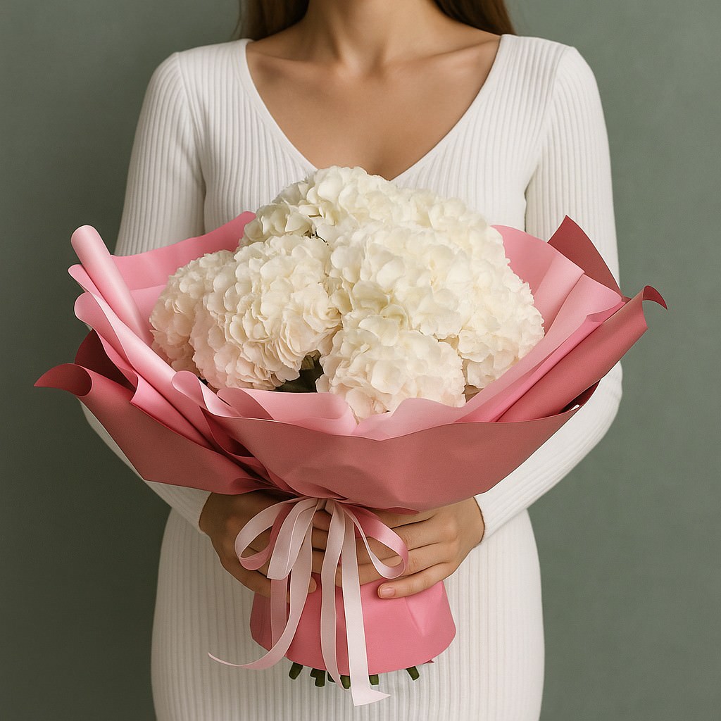 Стильный и утончённый букет из кремовых гортензий, собранных в контрастной серой упаковке. Он подойдёт как для торжественного подарка, так и для изысканного комплимента.