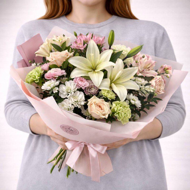 | Состав: | Альстромерии, Гвоздики, Лилии, Розы, Хризантемы |