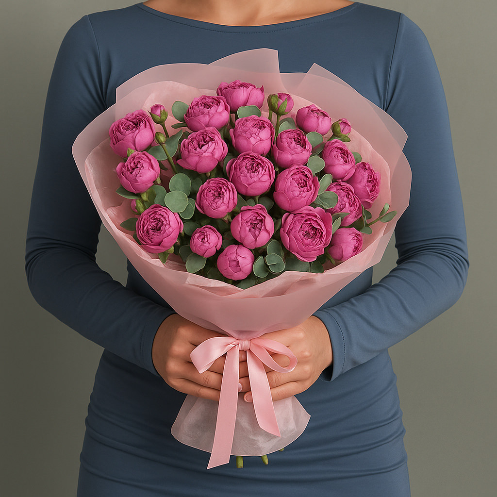 Очаровательный букет пионовидных роз в нежно-малиновом оттенке — это воплощение женственности, утончённости и гармонии. Его насыщенные лепестки и свежая зелень создают стильную композицию, которая станет идеальным подарком для дня рождения, юбилея или признания в чувствах. Такой букет подчеркнёт особый момент и подарит атмосферу радости.