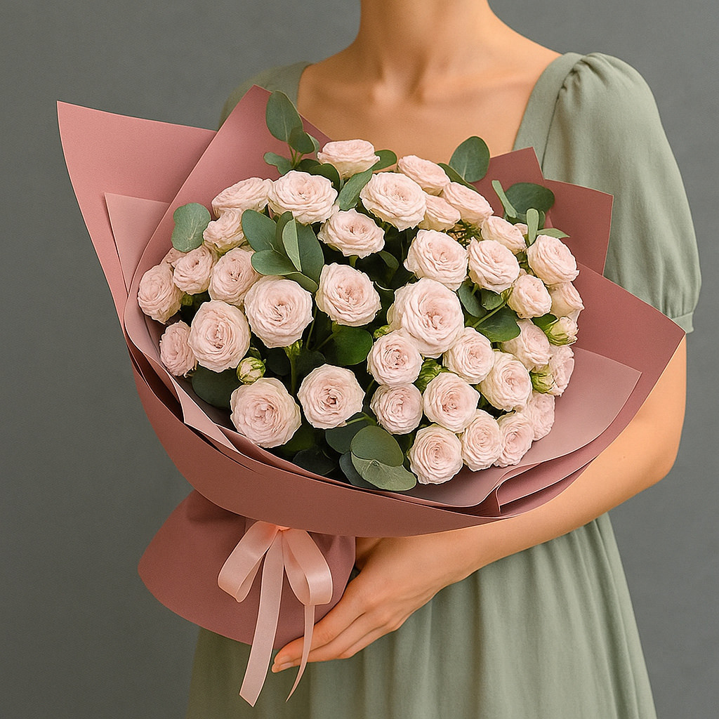 Букет «Пленительная утонченность» — утончённый подарок, наполненный мягкостью и изяществом. Пудрово-розовые розы в сочетании с свежей зеленью создают атмосферу романтики и тепла.